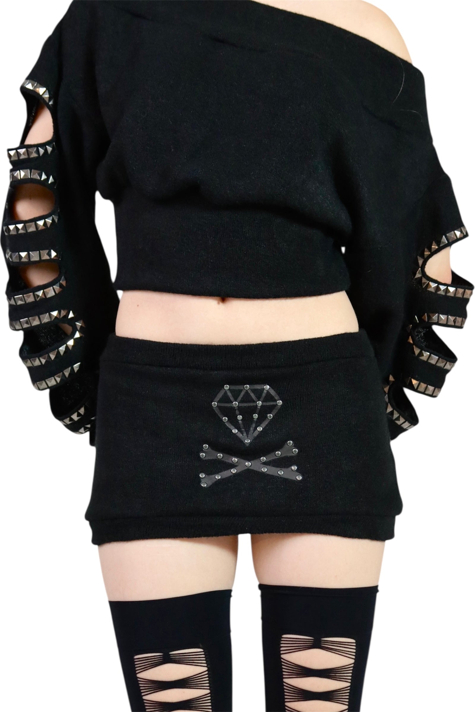 The skirt is made from soft and warm knitted angora, smooth to the touch. It features a printed black diamond with metallic stone accents for a bold finish.