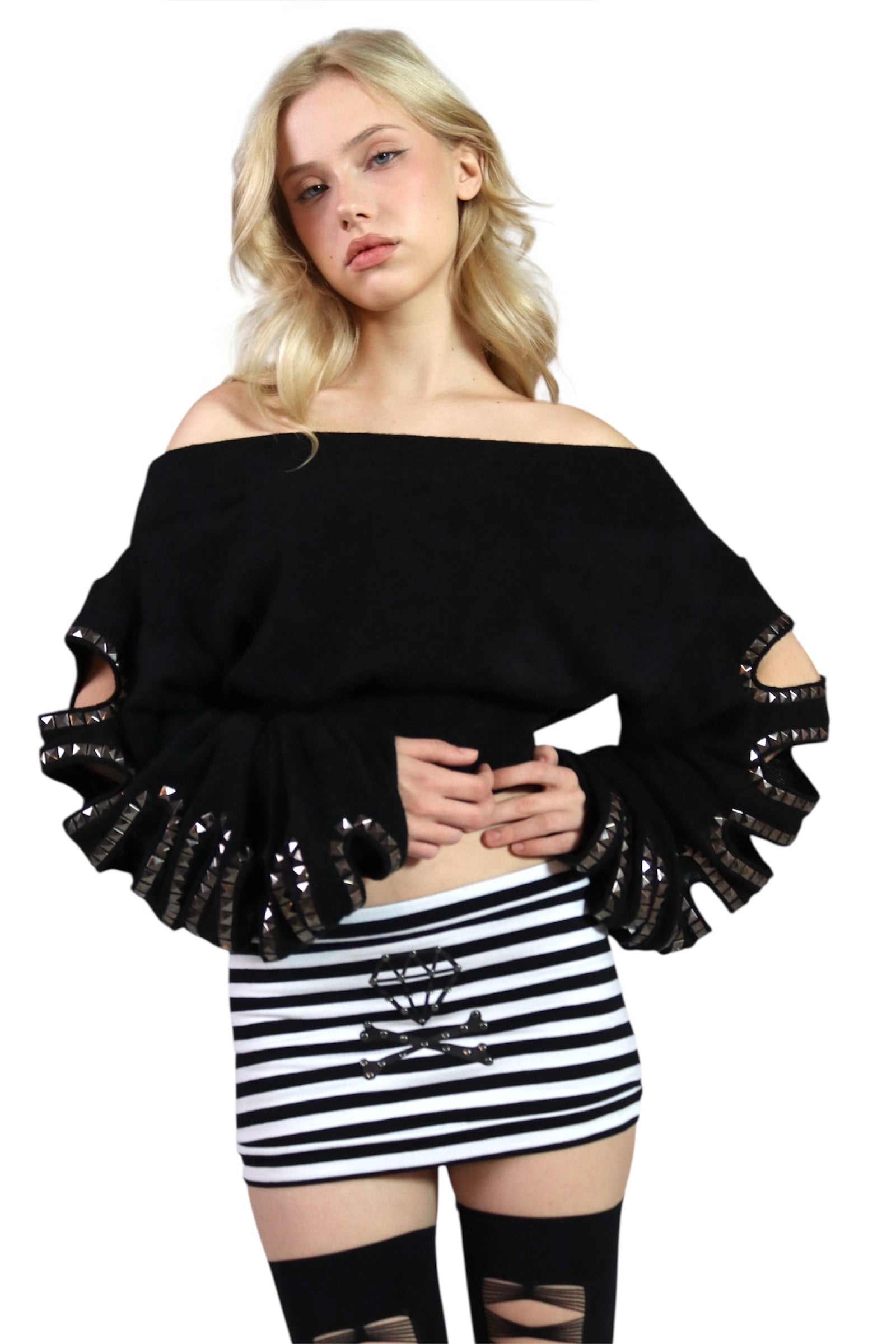 The skirt is made from soft striped cotton with a touch of elastane for a comfortable stretch fit. It features a printed black diamond design with metallic stone details that add a bold, striking accent.
